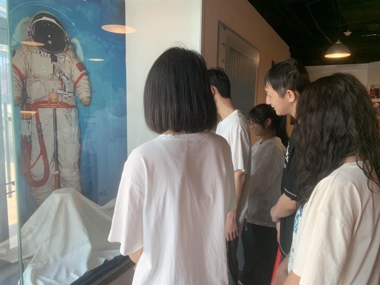 紡織博物館“當代紡織”展區(qū)一角,以"神七"飛船宇航員走出艙外為背景的展示窗內,展出一塊乳白色布料引起同學們的興趣。