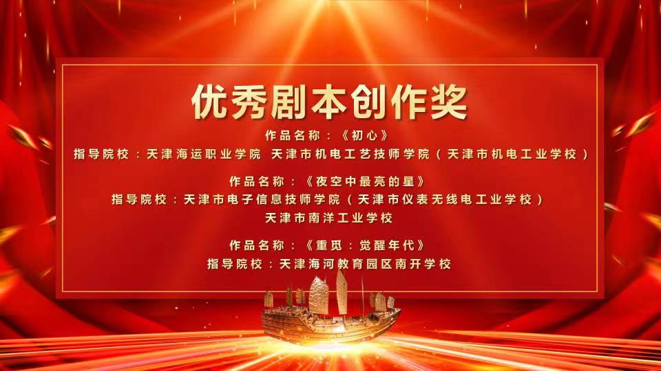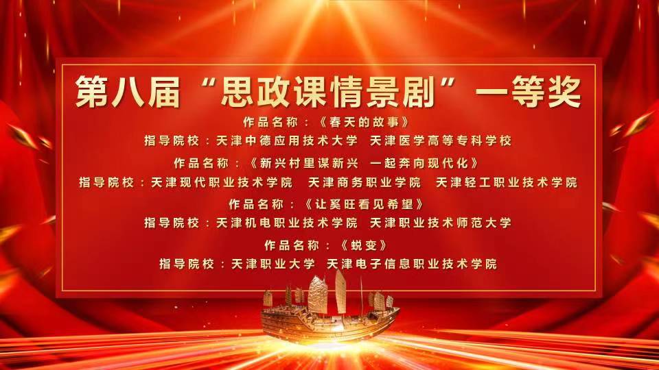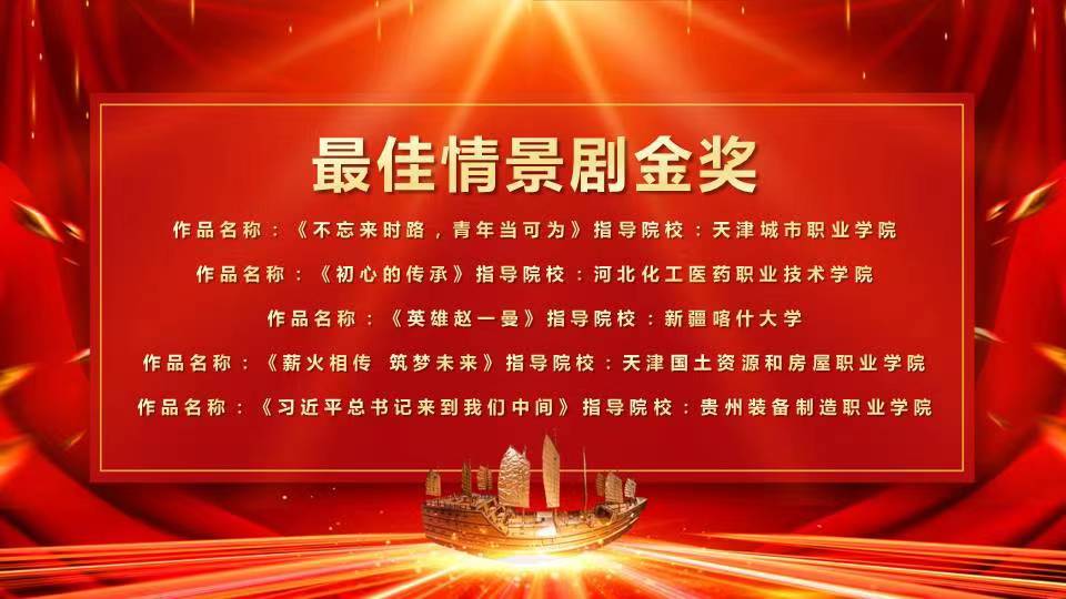經過緊張激烈的角逐和精彩展示,天津中德應用技術大學和天津醫學高等專科學校的作品《春天的故事》,天津現代職業技術學院、天津商務職業學院、天津輕工職業技術學院三所學校合作的作品《新興村里謀新興,一起奔向現代化》,天津機電職業技術學院和天津職業技術師范大學的作品《讓奚旺看見希望》,天津職業大學和天津電子信息職業技術學院的作品《蛻變》榮獲本次大賽一等獎;天津海運職業學院和天津市機電工藝技師學院(天津市機電工業學校)的作品《初心》、天津市電子信息技師學院(天津市儀表無線電工業學校)和天津市南洋工業學校的作品《夜空中最亮的星》、天津海河教育園區南開學校的作品《重覓:覺醒年代》榮獲優秀劇本創作獎;來自天津城市職業學院、河北化工醫藥職業技術學院、新疆喀什大學、天津國土資源和房屋職業學院、貴州裝備制造職業學院的展演作品獲得最佳情景劇金獎。最后,與會領導和專家為獲獎教師和參賽隊伍代表頒獎。