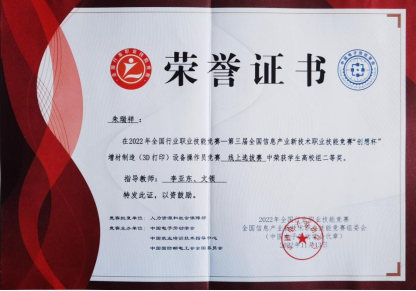 “2022年全國行業職業技能競賽—第三屆全國信息產業新技術職業技能競賽—‘創想杯’增材制造(3D 打?。┰O備操作員競賽”,來自全國192支參賽隊參加了云端原創作品角逐。我校參賽選手朱瑞祥和張建建的自主創新設計作品“開錐栗神器”和“四爪機械手”,分別榮獲高校組二等獎和三等獎。