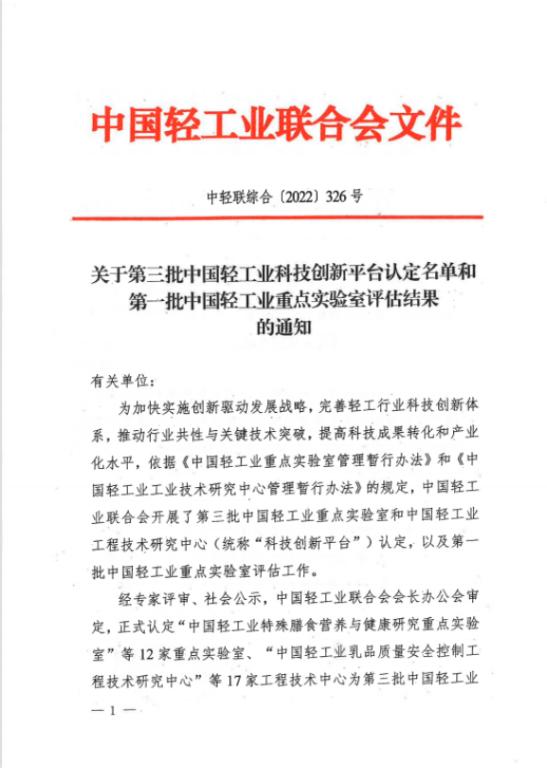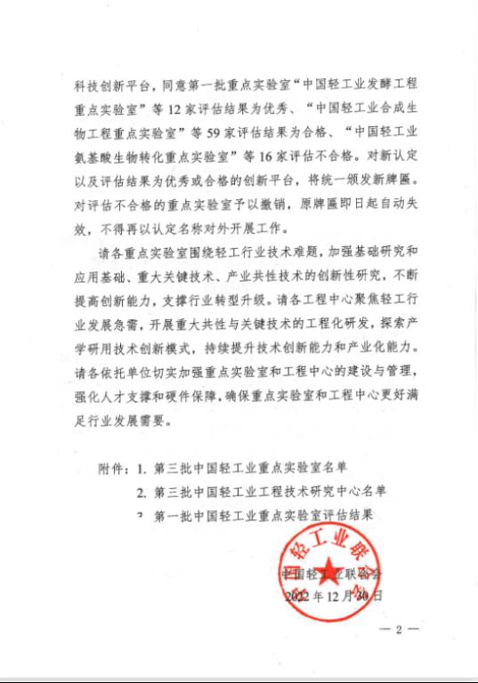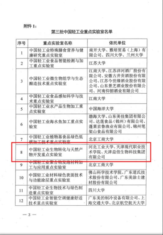 近日,中國輕工業聯合會公布了《關于第三批中國輕工業科技平臺認定名單和第一批中國輕工業評估結果的通知》,經過申報、答辯、專家評審、社會公示、中國輕工業聯合會會長辦公會審定,正式認定了12家重點實驗室為第三批中國輕工業科技平臺。我院與河北工業大學、天津益倍生物科技集團有限公司共同申報的《中國輕工業生物轉化與天然產物開發重點實驗室》名列其中。