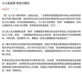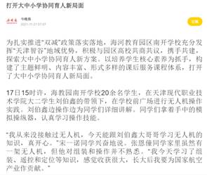 智能工程學院與天津海河教育園區南開學校簽署了共建“勞動教育普職融合實踐基地”協議,共同探索大中小學一體化勞動教育新模式。無人機專業優秀學生代表在專業教師的指導下,自2021年3月起,每周三下午前往南開學校開展三年級至五年級《航空智能科技實驗室》以及《航空器制作與控制》兩門素拓課程。通過參加素拓課程,極大提高了小學生對航空航天的熱愛,增強了動手能力,對飛行安全、空氣動力學、飛行器構造、數據鏈路等相關知識有了初步了解。截止目前,智能工程學院共承擔了南開學校昭惠路校區拓展課程2門、雅潤路校區拓展課程1門,得到了學校及家長的充分認可。協同開展特色勞動教育,讓中小學生充分進行了勞動體驗,也讓學院學生學有所展、發揮所長,極大地提升了學生的職業意識和職業自信。勞動育人活動在今晚報、北方網、中國日報網、光明網、國際在線等11家媒體相繼報道。