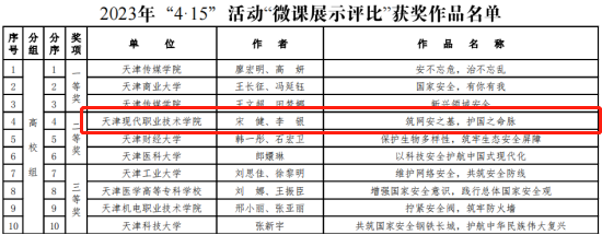 5月12日,市教育兩委組織“國家安全教育課程微課展示評比活動”并完成了參評作品的評審工作。經專家組逐一評審,20部作品被評為此次活動獲獎作品。其中,我校信息工程學院教師宋健、李銀的參評作品《筑網安之基,護國之命脈》榮獲高校組二等獎。