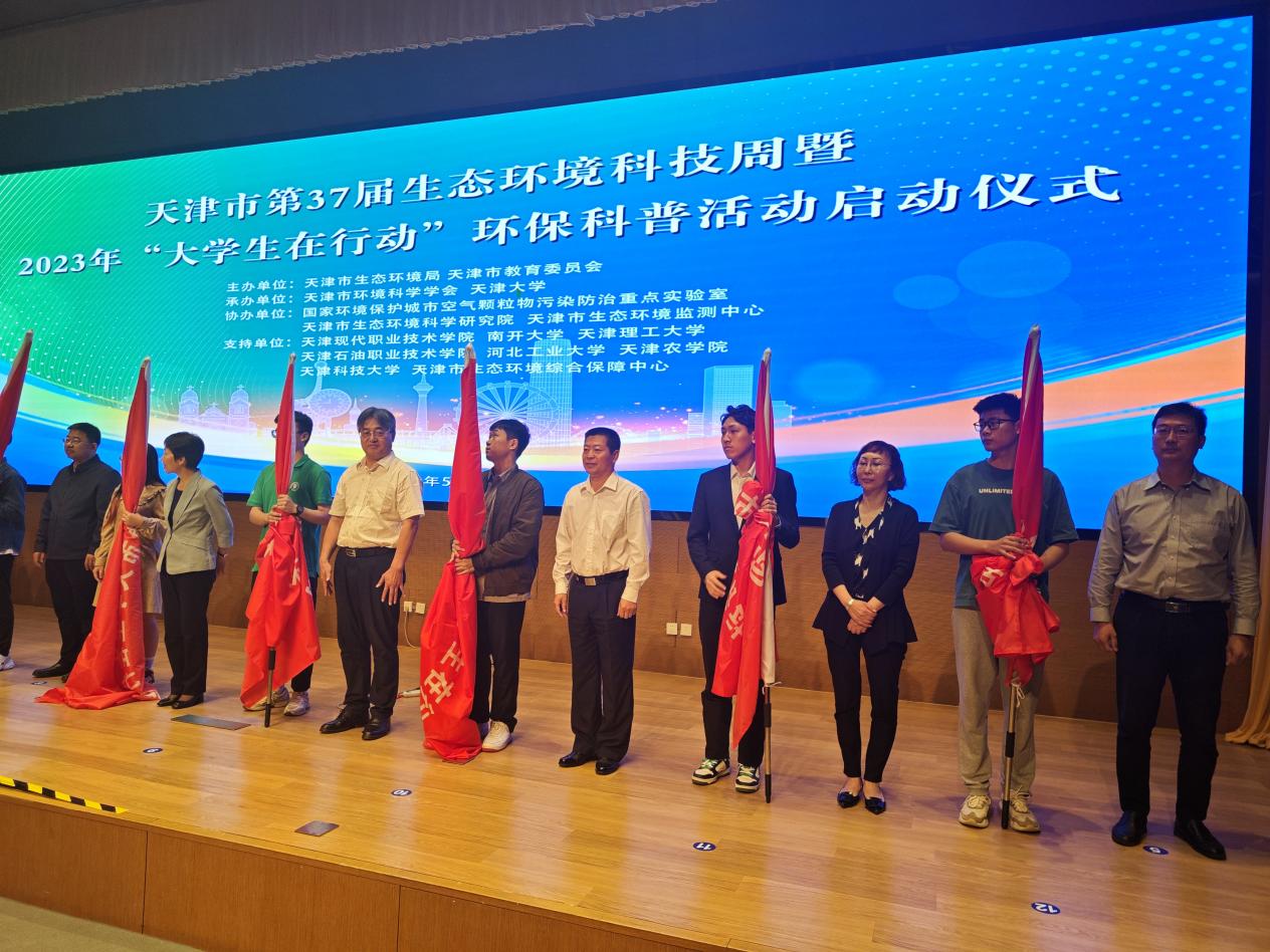 啟動(dòng)儀式臨近結(jié)束時(shí),各校學(xué)生代表上臺(tái)接受授旗,最后,張弢宣布,天津市第37屆生態(tài)環(huán)境科技周暨2023年“大學(xué)生在行動(dòng)”活動(dòng)正式啟動(dòng)。