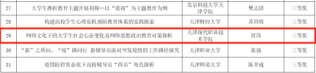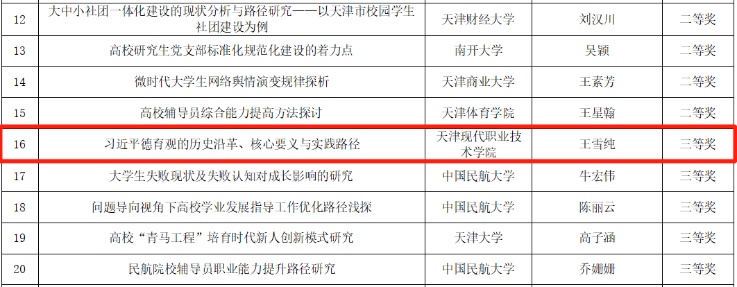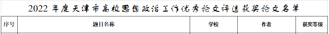 近日,天津市教育兩委公布了2022年度天津市高校思想政治工作優(yōu)秀論文評(píng)選活動(dòng)結(jié)果。我校輔導(dǎo)員賈瑋和思政課教師王雪純提交的兩篇論文喜獲三等獎(jiǎng)。