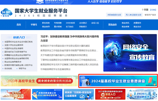 2024屆畢業(yè)生登錄“國家大學生就業(yè)服務(wù)平臺” (https://www.ncss.cn)填寫“2024屆高校畢業(yè)生就業(yè)意愿調(diào)查”。