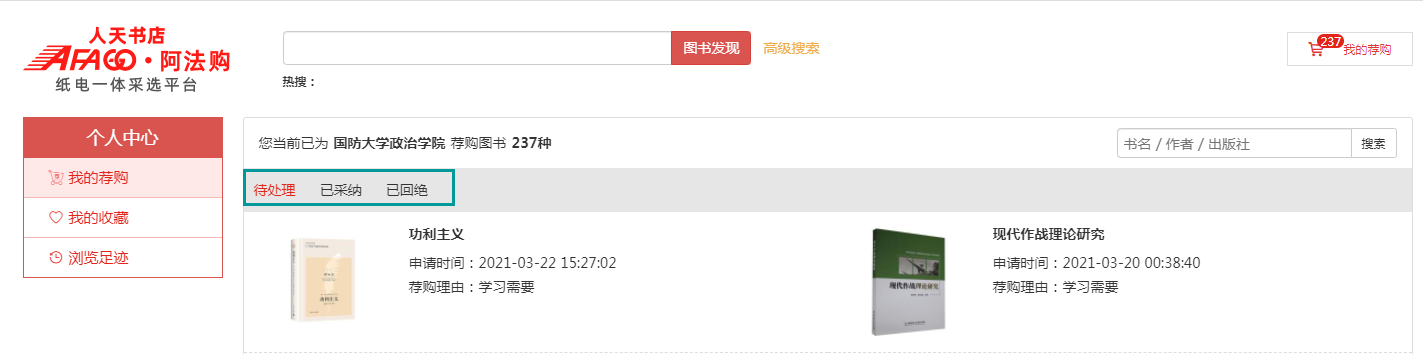 4、我的薦購:【個人中心】→【我的薦購】中可查看到所有的薦購書目,及圖書館的采納情況。