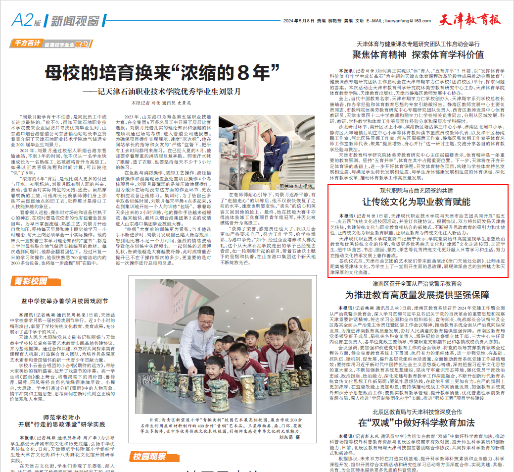 本報(bào)訊(記者劉佳)日前,天津現(xiàn)代職業(yè)技術(shù)學(xué)院與天津市曲藝團(tuán)共同開(kāi)展“迎五一、慶五四”傳統(tǒng)文化進(jìn)校園活動(dòng),并簽訂共建協(xié)議。根據(jù)協(xié)議,雙方將共同發(fā)揚(yáng)天津曲