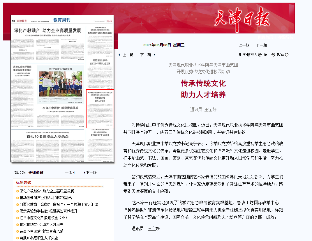 為持續推進中華優秀傳統文化進校園,近日,天津現代職業技術學院與天津市曲藝團共同開展“迎五一、慶五四”傳統文化進校園活動,并簽訂共建協議。