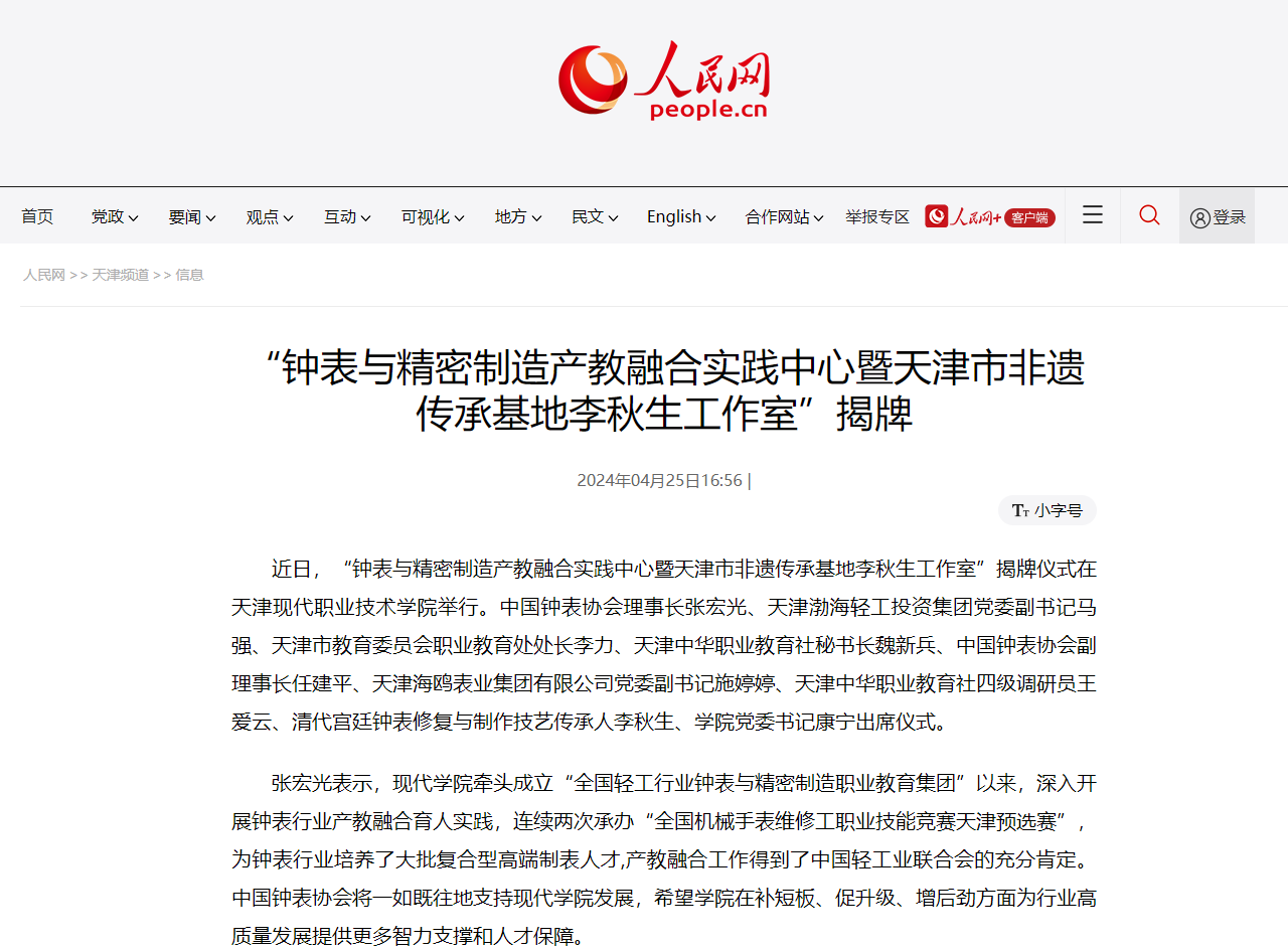 近日,“鐘表與精密制造產教融合實踐中心暨天津市非遺傳承基地李秋生工作室”揭牌儀式在天津現代職業技術學院舉行。中國鐘表協會理事長張宏光、天津渤海輕工投資集團黨委副書記馬強、天津市教育委員會職業教育處處長李力、天津中華職業教育社秘書長魏新兵、中國鐘表協會副理事長任建平、天津海鷗表業集團有限公司黨委副書記施婷婷、天津中華職業教育社四級調研員王愛云、清代宮廷鐘表修復與制作技藝傳承人李秋生、學院黨委書記康寧出席儀式。