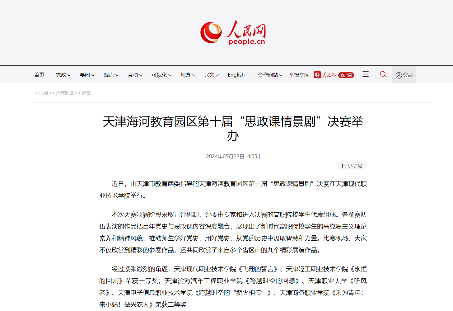 近日,由天津市教育兩委指導的天津海河教育園區第十屆“思政課情景劇”決賽在天津現代職業技術學院舉行。