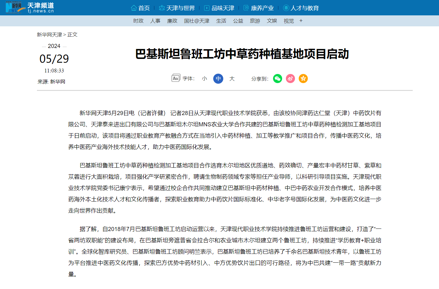 新華網天津5月29日電(記者許健) 記者28日從天津現代職業技術學院獲悉,由該校協同津藥達仁堂(天津)中藥飲片有限公司、天津泰來進出口有限公司與巴基斯坦木爾坦MNS農業大學合作共建的巴基斯坦魯班工坊中草藥種植檢測加工基地項目于日前啟動,該項目將通過職業教育產教融合方式在當地引入中藥材種植、加工等教學推廣和項目合作,傳播中醫藥文化,培養中醫藥產業海外技術技能人才,助力中醫藥國際化發展。