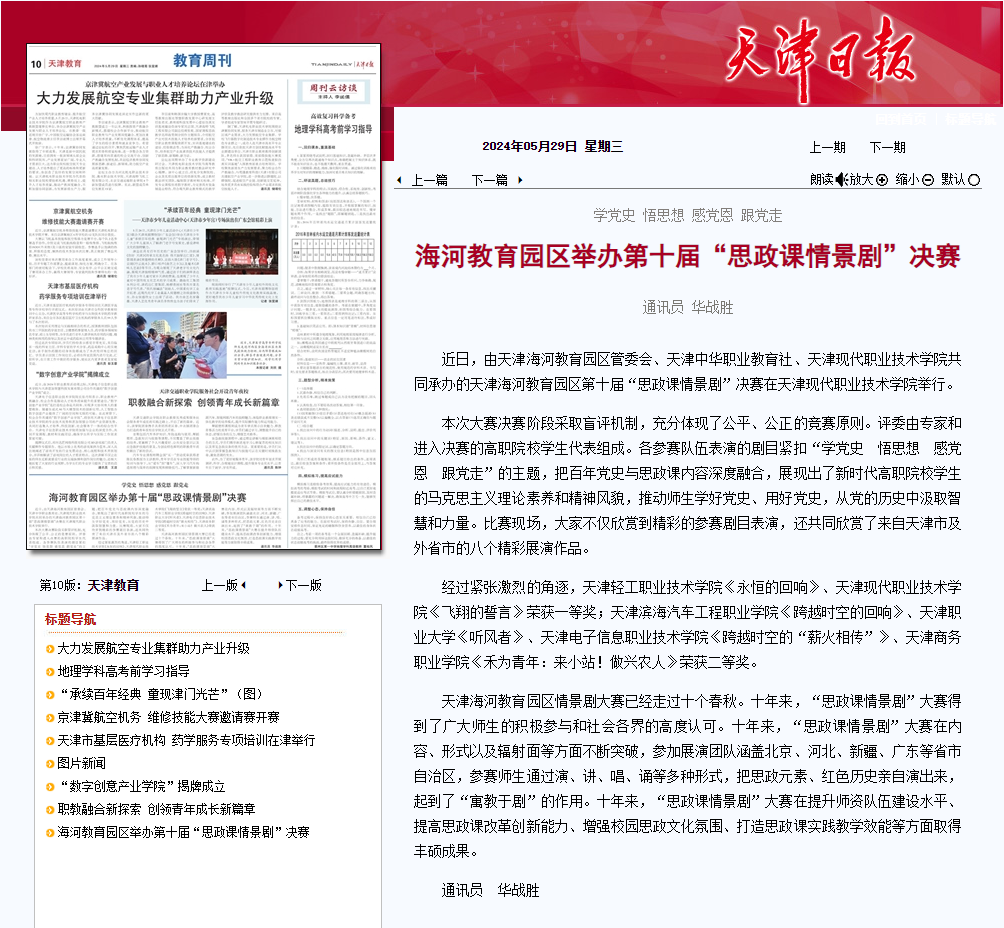 近日,由天津海河教育園區管委會、天津中華職業教育社、天津現代職業技術學院共同承辦的天津海河教育園區第十屆“思政課情景劇”決賽在天津現代職業技術學院舉行。