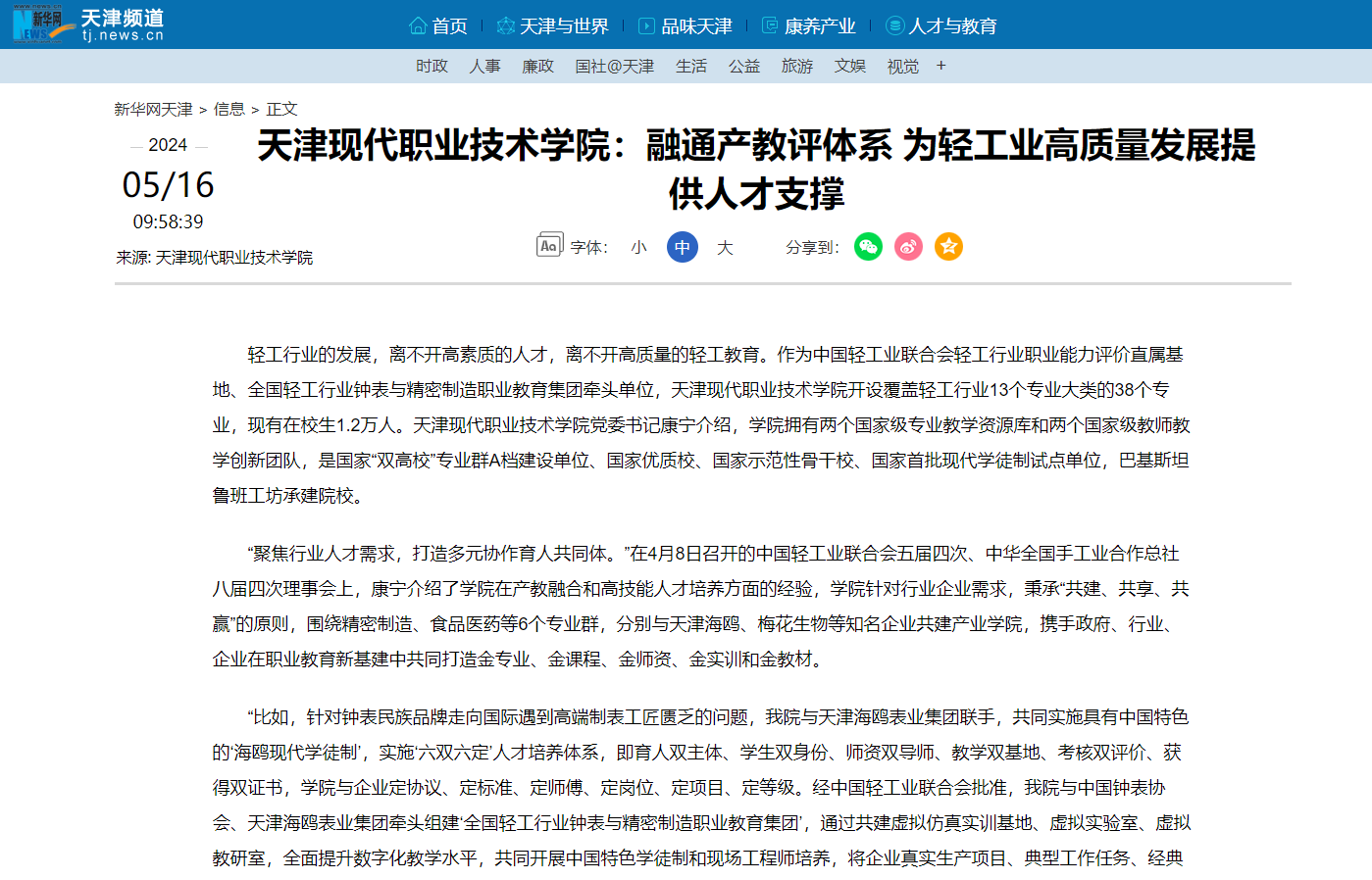 輕工行業(yè)的發(fā)展,離不開高素質(zhì)的人才,離不開高質(zhì)量的輕工教育。作為中國(guó)輕工業(yè)聯(lián)合會(huì)輕工行業(yè)職業(yè)能力評(píng)價(jià)直屬基地、全國(guó)輕工行業(yè)鐘表與精密制造職業(yè)教育集團(tuán)牽頭單位,天津現(xiàn)代職業(yè)技術(shù)學(xué)院開設(shè)覆蓋輕工行業(yè)13個(gè)專業(yè)大類的38個(gè)專業(yè),現(xiàn)有在校生1.2萬(wàn)人。天津現(xiàn)代職業(yè)技術(shù)學(xué)院黨委書記康寧介紹,學(xué)院擁有兩個(gè)國(guó)家級(jí)專業(yè)教學(xué)資源庫(kù)和兩個(gè)國(guó)家級(jí)教師教學(xué)創(chuàng)新團(tuán)隊(duì),是國(guó)家“雙高校”專業(yè)群A檔建設(shè)單位、國(guó)家優(yōu)質(zhì)校、國(guó)家示范性骨干校、國(guó)家首批現(xiàn)代學(xué)徒制試點(diǎn)單位,巴基斯坦魯班工坊承建院校。