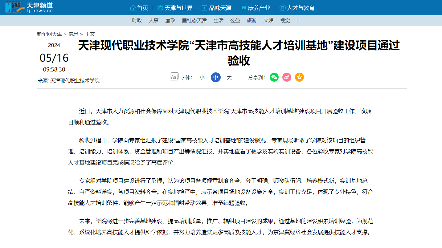 近日,天津市人力資源和社會保障局對天津現代職業技術學院“天津市高技能人才培訓基地”建設項目開展驗收工作,該項目順利通過驗收。