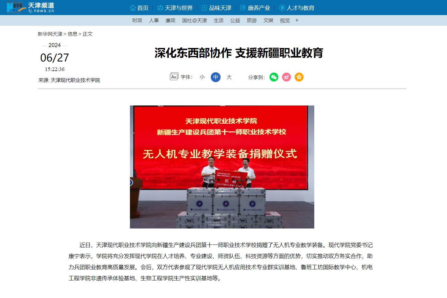 ??近日,天津現代職業技術學院向新疆生產建設兵團第十一師職業技術學校捐贈了無人機專業教學裝備。現代學院黨委書記康寧表示,學院將充分發揮現代學院在人才培養、專業建設、師資隊伍、科技資源等方面的優勢,切實推動雙方務實合作,助力兵團職業教育高質量發展。會后,雙方代表參觀了現代學院無人機應用技術專業群實訓基地、魯班工坊國際教學中心、機電工程學院非遺傳承體驗基地、生物工程學院生產性實訓基地等。
