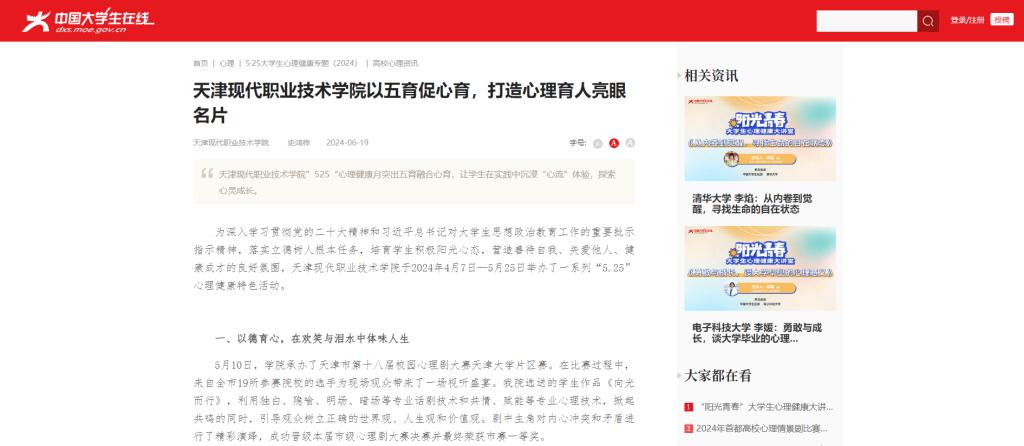 為深入學習貫徹黨的二十大精神和習近平總書記對大學生思想政治教育工作的重要批示指示精神,落實立德樹人根本任務,培育學生積極陽光心態,營造善待自我、關愛他人、健康成才的良好氛圍,天津現代職業技術學院于2024年4月7日—5月25日舉辦了一系列“5.25”心理健康特色活動。