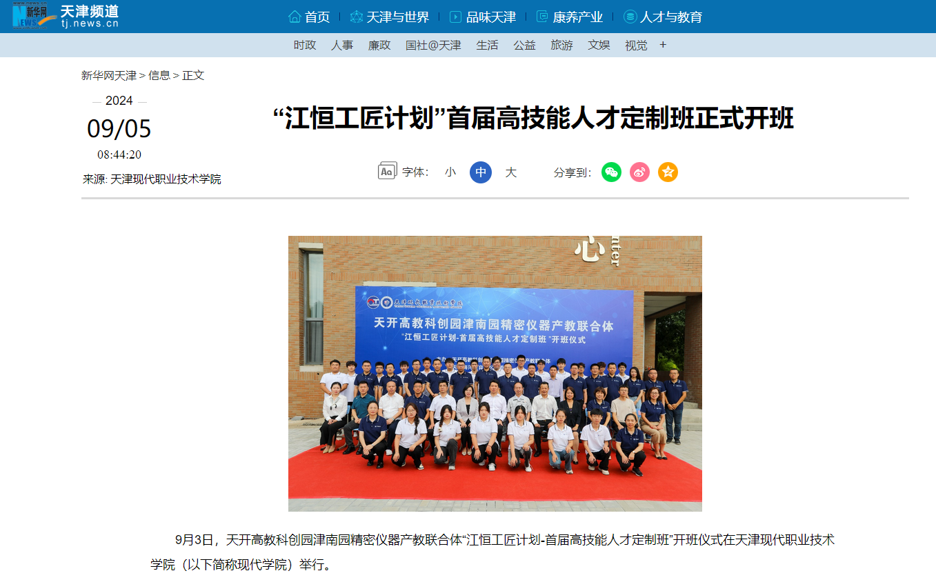 開班儀式上,海河教育園區管委會、江恒產業-天津高端精密儀器產業園以及現代學院領導均表示啟動工匠人才定制班,是響應國家關于弘揚工匠精神、加快推進發展職業教育“一體兩翼”戰略部署,是天開高教科創園津南園精密儀器產教聯合體深化產教融合、校企合作的重要舉措,通過校企雙元育人模式,為學生提供更為精準、更具針對性的職業技能培養。在市域產教聯合體平臺牽引下,園區、院校、企業將能夠產生更多的化學反應,拓展出更多的合作空間,結出更加豐碩的成果,為推動天津高質量發展作出技能人才支撐的貢獻。