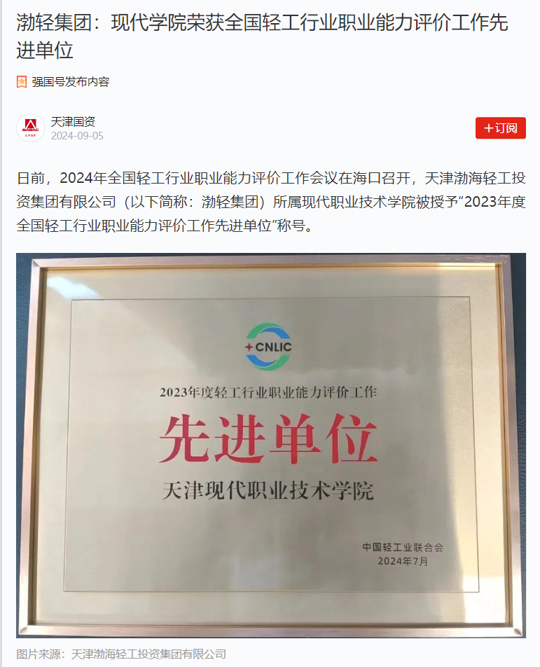 日前,2024年全國輕工行業職業能力評價工作會議在海口召開,天津渤海輕工投資集團有限公司(以下簡稱:渤輕集團)所屬現代職業技術學院被授予“2023年度全國輕工行業職業能力評價工作先進單位”稱號。