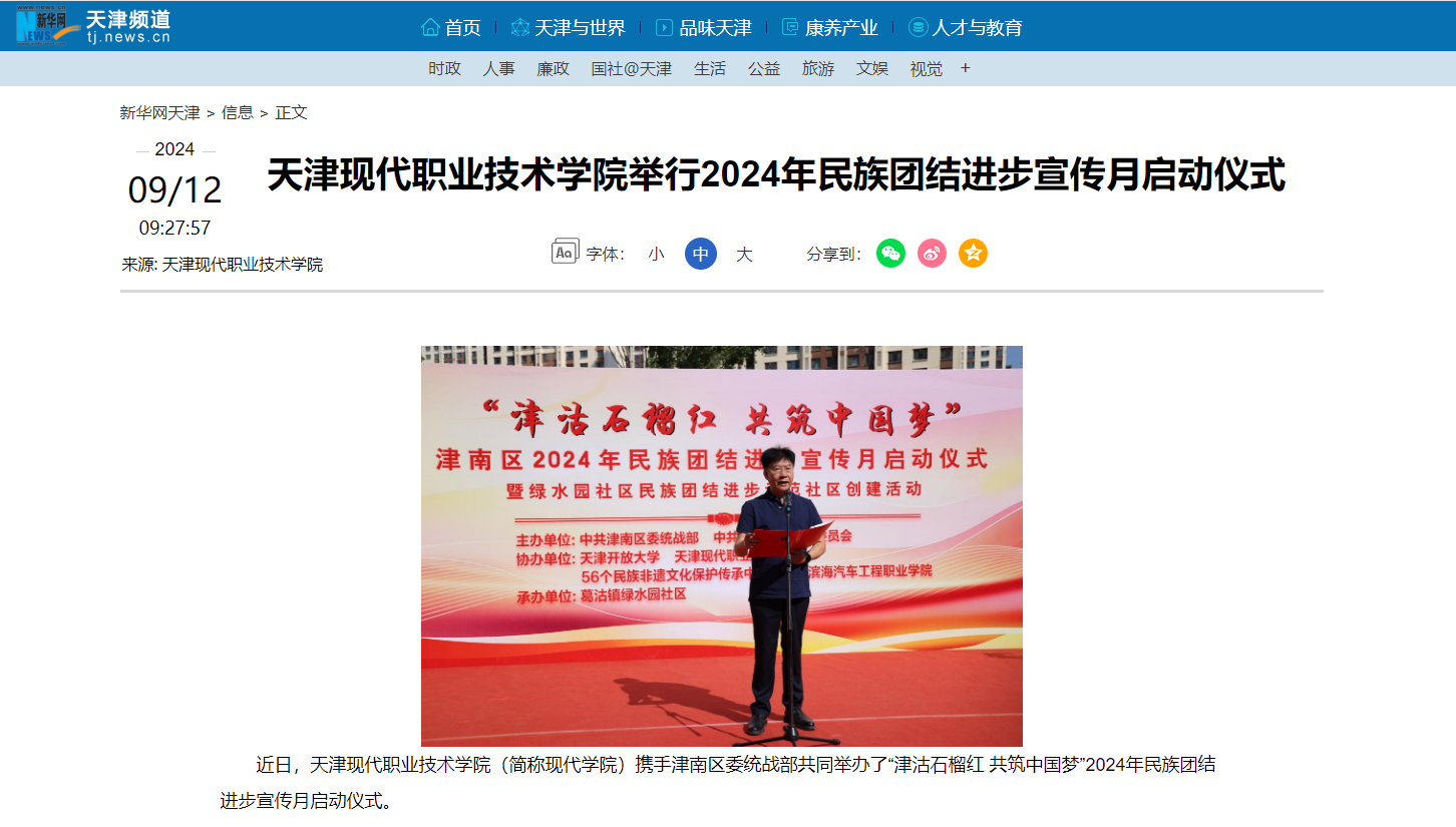 ??近日,天津現(xiàn)代職業(yè)技術(shù)學院(簡稱現(xiàn)代學院)攜手津南區(qū)委統(tǒng)戰(zhàn)部共同舉辦了“津沽石榴紅 共筑中國夢”2024年民族團結(jié)進步宣傳月啟動儀式。
