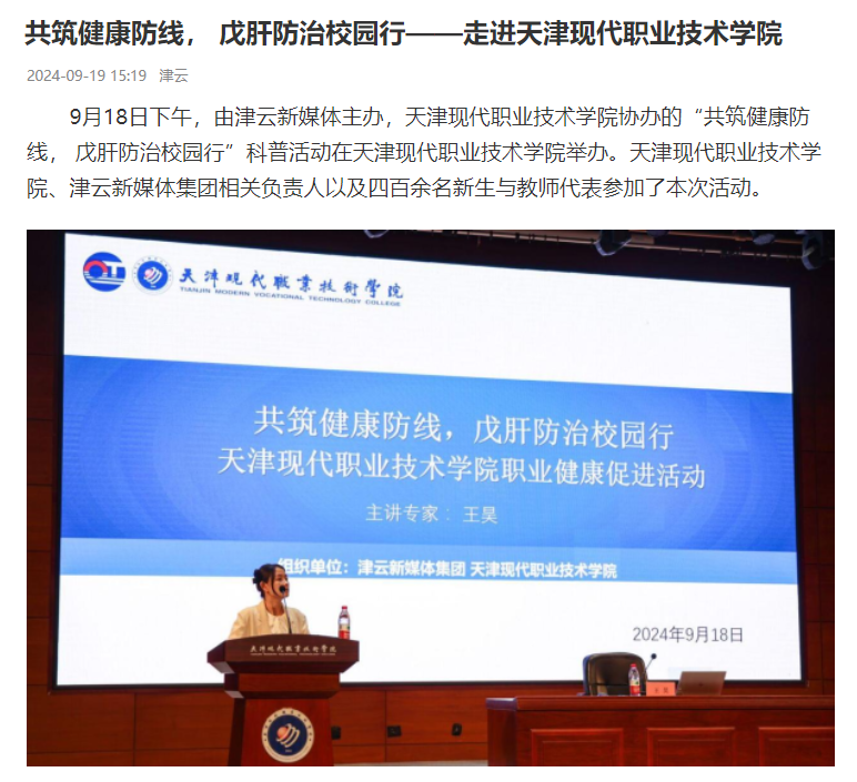 9月18日下午,由津云新媒體主辦,天津現(xiàn)代職業(yè)技術(shù)學(xué)院協(xié)辦的“共筑健康防線, 戊肝防治校園行”科普活動在天津現(xiàn)代職業(yè)技術(shù)學(xué)院舉辦。天津現(xiàn)代職業(yè)技術(shù)學(xué)院、津云新媒體集團(tuán)相關(guān)負(fù)責(zé)人以及四百余名新生與教師代表參加了本次活動。