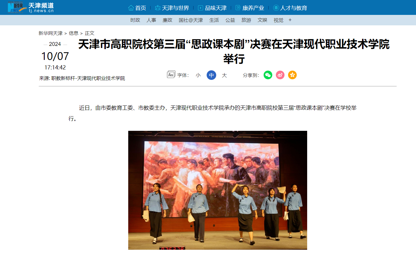近日,由市委教育工委、市教委主辦,天津現(xiàn)代職業(yè)技術(shù)學(xué)院承辦的天津市高職院校第三屆“思政課本劇”決賽在學(xué)校舉行。