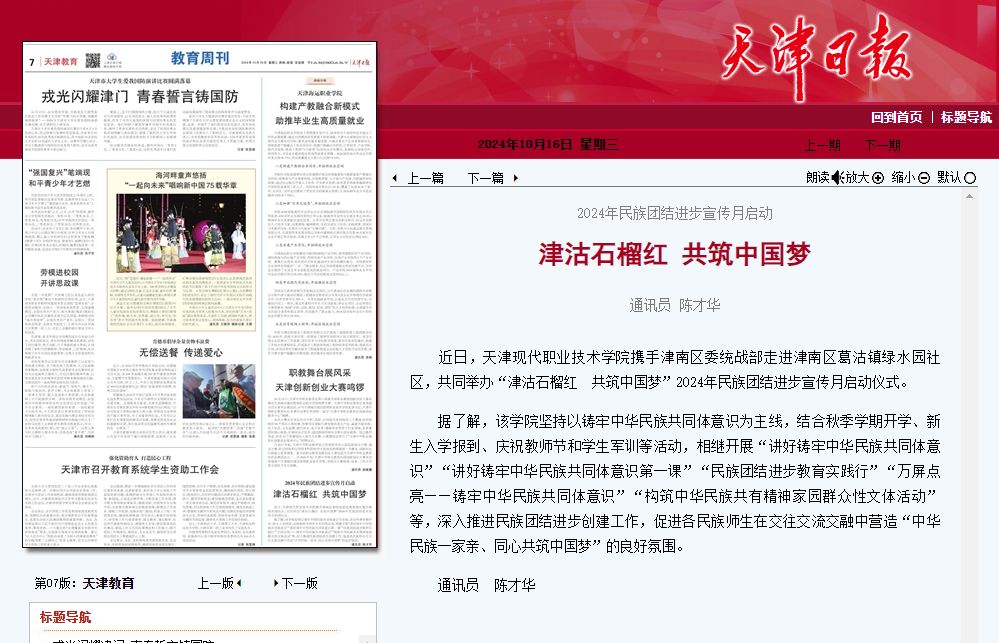 近日,天津現代職業技術學院攜手津南區委統戰部走進津南區葛沽鎮綠水園社區,共同舉辦“津沽石榴紅 共筑中國夢”2024年民族團結進步宣傳月啟動儀式。