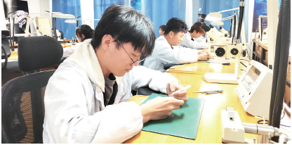天津現代職業技術學院機電工程學院的鐘表與精密制造產教融合實踐中心的天津市首批非物質文化遺產傳承基地,一場跨時代的技藝傳承正在上演。符合國際標準的理實一體化實踐教學基地內,學生們身著白色工作服,在專用的光學放大儀器下全神貫注地組裝和調試著手表機芯,這些由100多個細小零件組成的機芯在學生們的巧手下逐漸蘇醒。