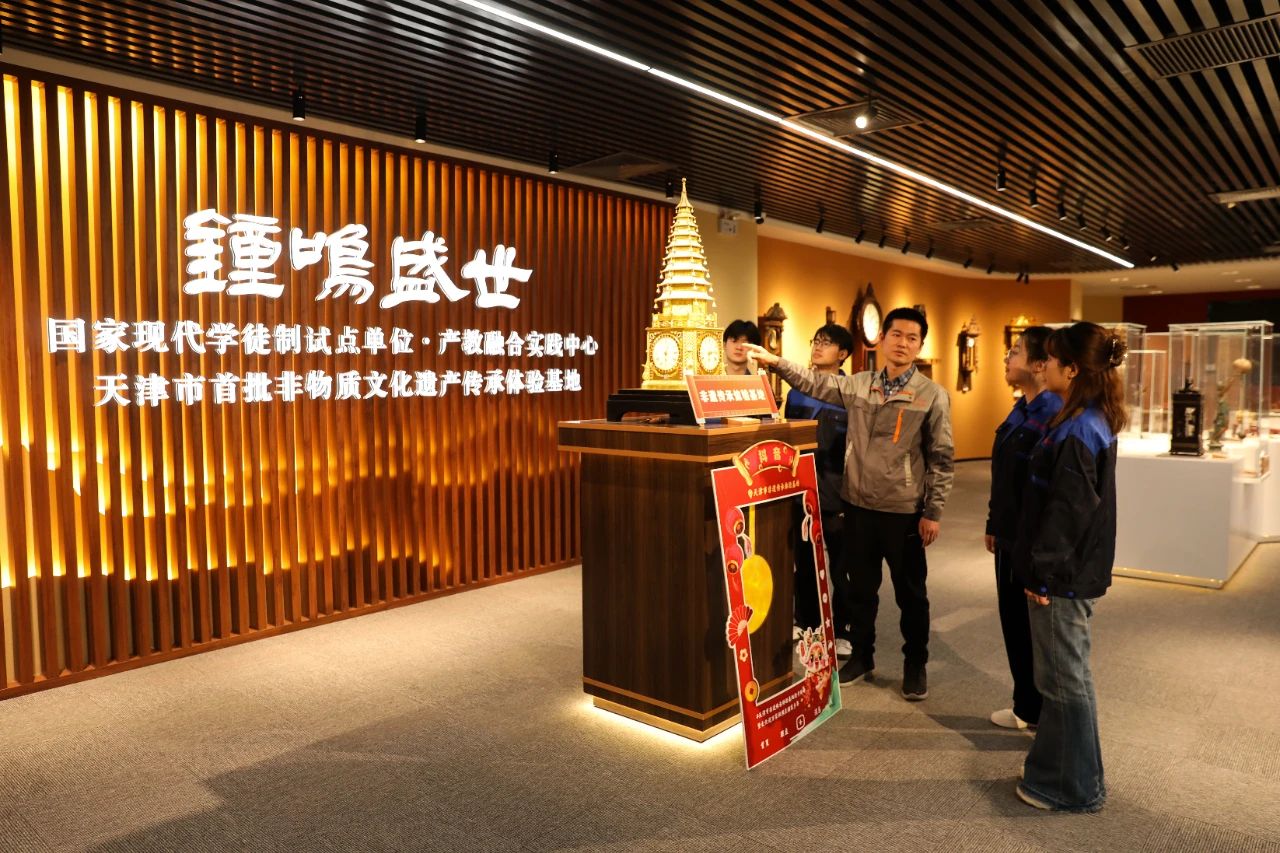 天津現代職業技術學院創新“大師室+實訓室+生產線”全程化培養路徑,在三年的學習中,學生們會經歷“師傅”在“‘大師室’面對面帶徒弟、在‘實訓室’一對一帶徒弟、在‘生產線’上手把手帶徒弟”的工匠精神與創新能力一體化培養。企業深度參與人才培養的各環節和全過程,強化鐘表行業特有的“高精細、高精密、高精準”“三高”職業素養。