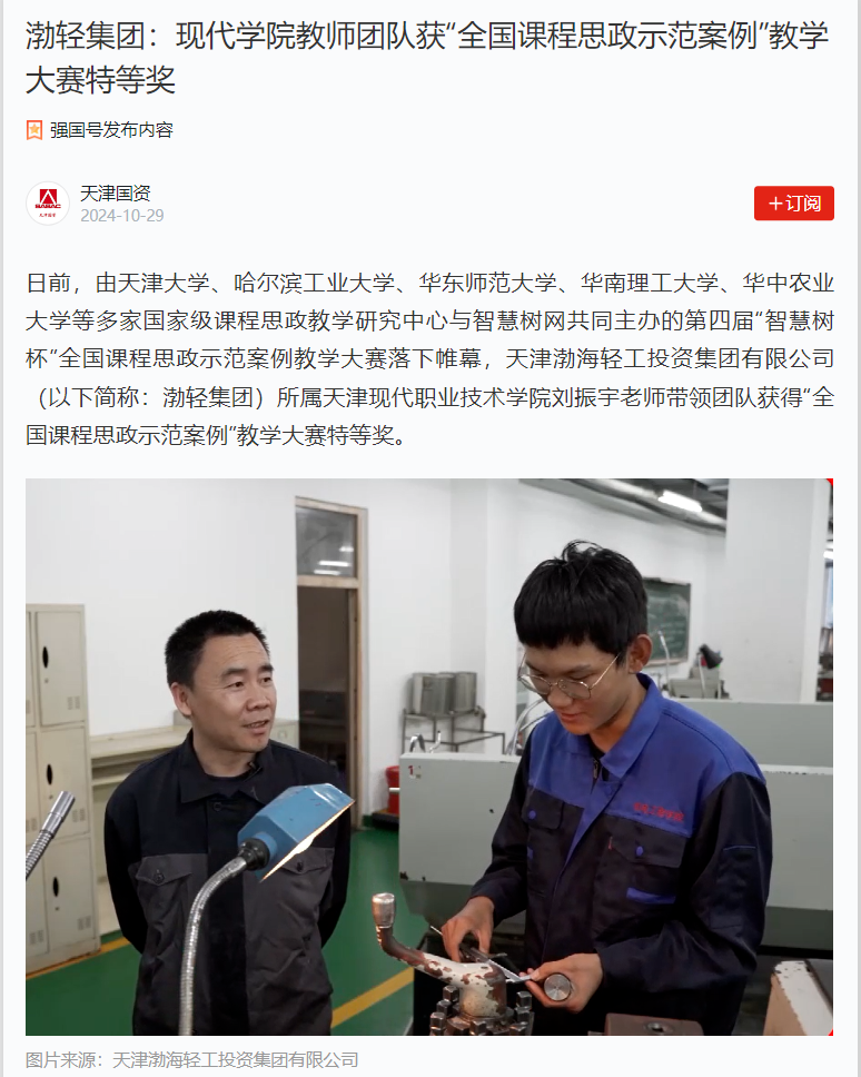 日前,由天津大學(xué)、哈爾濱工業(yè)大學(xué)、華東師范大學(xué)、華南理工大學(xué)、華中農(nóng)業(yè)大學(xué)等多家國家級課程思政教學(xué)研究中心與智慧樹網(wǎng)共同主辦的第四屆“智慧樹杯”全國課程思政示范案例教學(xué)大賽落下帷幕,天津渤海輕工投資集團有限公司(以下簡稱:渤輕集團)所屬天津現(xiàn)代職業(yè)技術(shù)學(xué)院劉振宇老師帶領(lǐng)團隊獲得“全國課程思政示范案例”教學(xué)大賽特等獎。