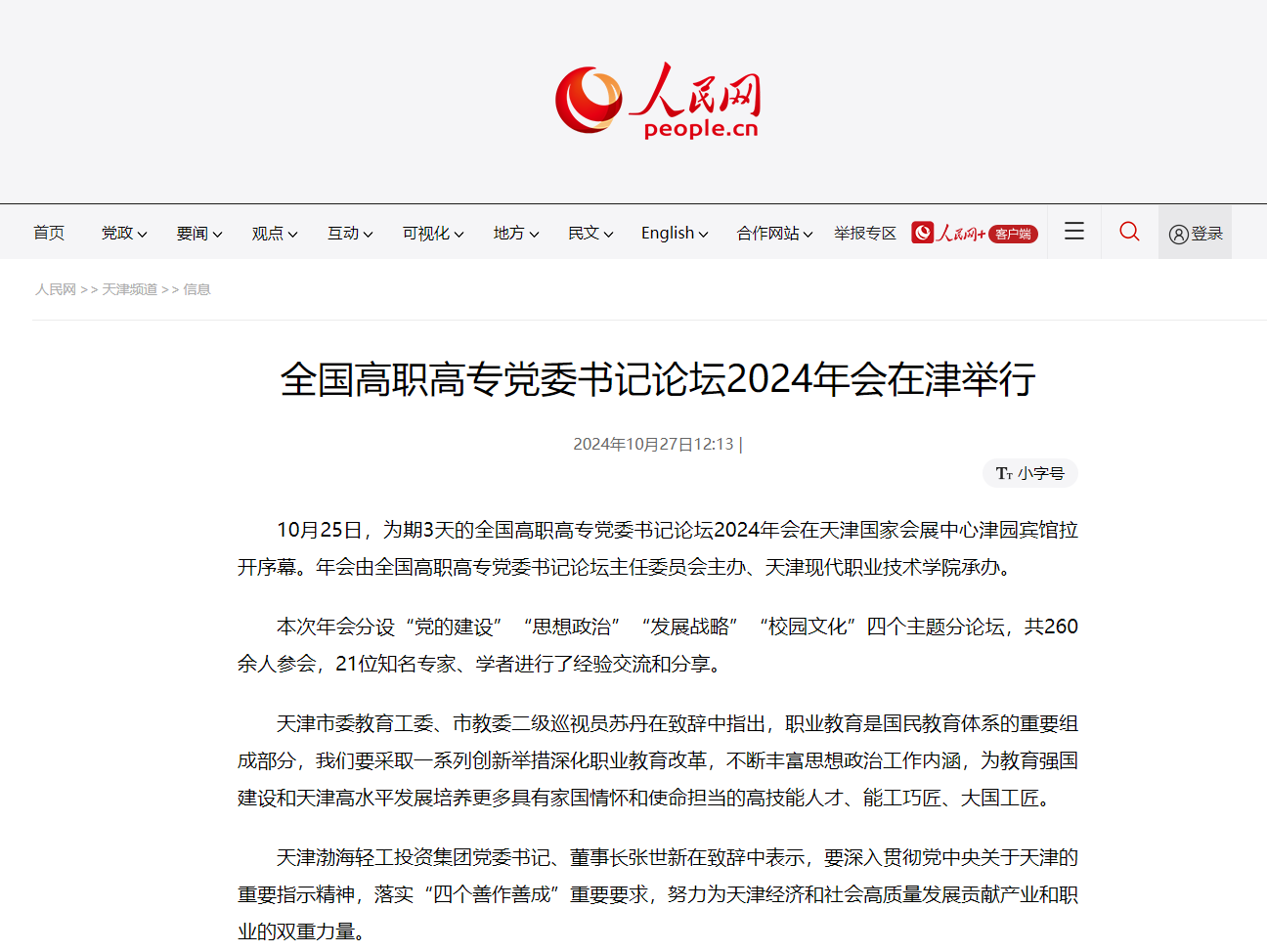 10月25日,為期3天的全國高職高專黨委書記論壇2024年會在天津國家會展中心津園賓館拉開序幕。年會由全國高職高專黨委書記論壇主任委員會主辦、天津現代職業技術學院承辦。