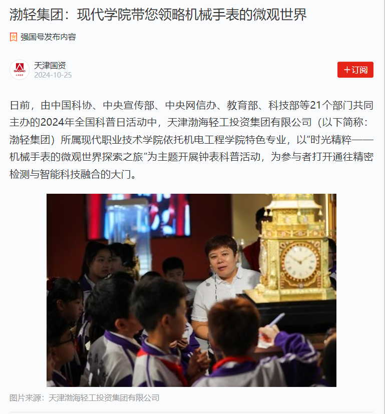 日前,由中國科協(xié)、中央宣傳部、中央網(wǎng)信辦、教育部、科技部等21個部門共同主辦的2024年全國科普日活動中,天津渤海輕工投資集團有限公司(以下簡稱:渤輕集團)所屬現(xiàn)代職業(yè)技術學院依托機電工程學院特色專業(yè),以“時光精粹——機械手表的微觀世界探索之旅”為主題開展鐘表科普活動,為參與者打開通往精密檢測與智能科技融合的大門。