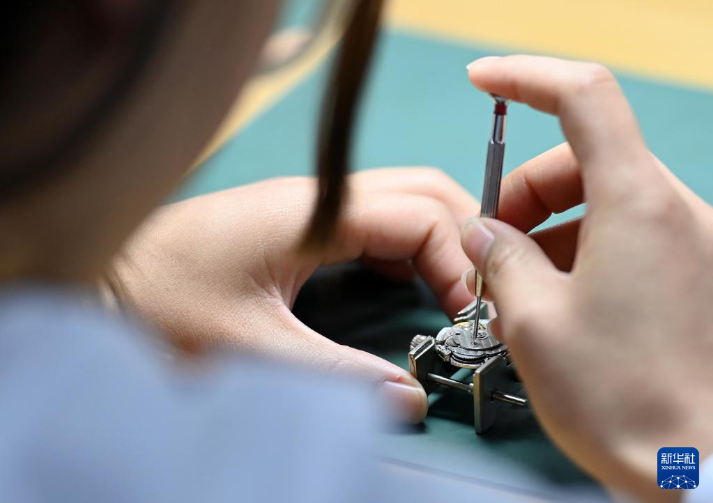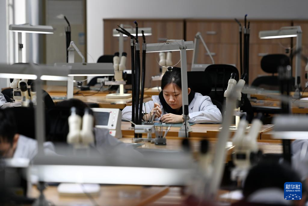 ??11月12日,天津現代職業技術學院學生在鐘表與精密制造產教融合實踐中心內調試手表機芯。