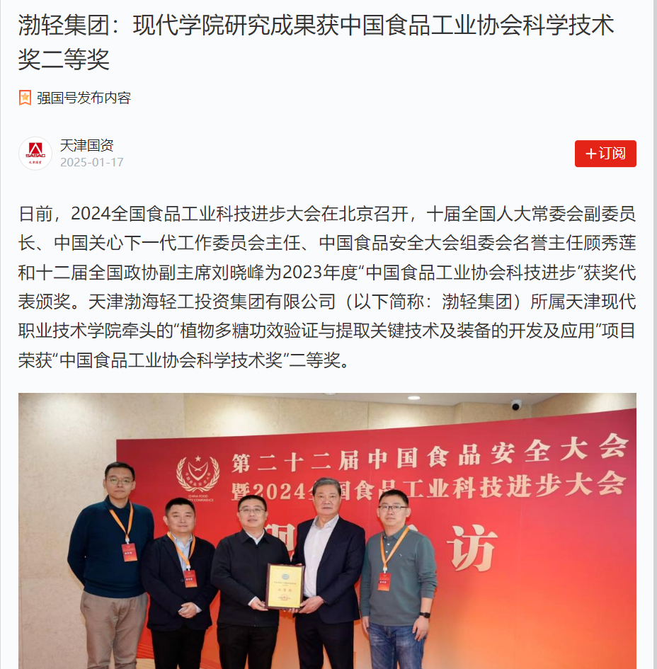 日前,2024全國食品工業科技進步大會在北京召開,十屆全國人大常委會副委員長、中國關心下一代工作委員會主任、中國食品安全大會組委會名譽主任顧秀蓮和十二屆全國政協副主席劉曉峰為2023年度“中國食品工業協會科技進步”獲獎代表頒獎。天津渤海輕工投資集團有限公司(以下簡稱:渤輕集團)所屬天津現代職業技術學院牽頭的“植物多糖功效驗證與提取關鍵技術及裝備的開發及應用”項目榮獲“中國食品工業協會科學技術獎”二等獎。