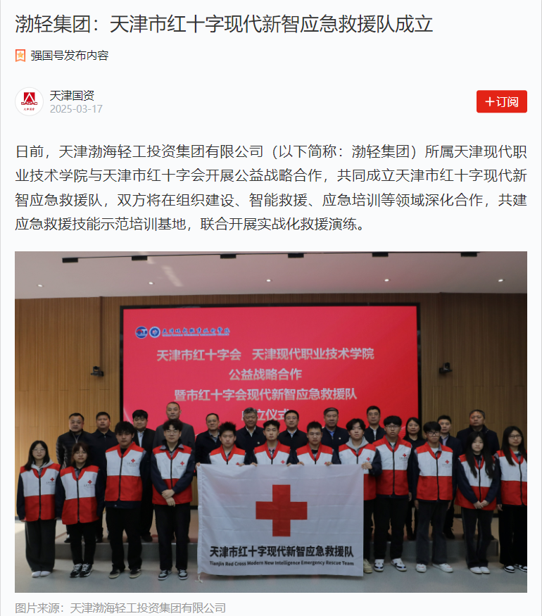 日前,天津渤海輕工投資集團有限公司(以下簡稱:渤輕集團)所屬天津現代職業技術學院與天津市紅十字會開展公益戰略合作,共同成立天津市紅十字現代新智應急救援隊,雙方將在組織建設、智能救援、應急培訓等領域深化合作,共建應急救援技能示范培訓基地,聯合開展實戰化救援演練。