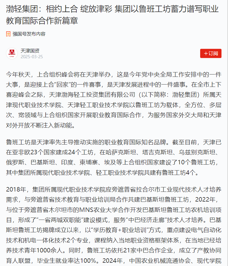 2018年,集團(tuán)所屬現(xiàn)代職業(yè)技術(shù)學(xué)院應(yīng)旁遮普省拉合爾市工業(yè)現(xiàn)代技術(shù)人才培養(yǎng)需求,與旁遮普省技術(shù)教育與職業(yè)培訓(xùn)局合作共建巴基斯坦魯班工坊,2022年,與位于旁遮普省木爾坦市的MNS農(nóng)業(yè)大學(xué)合作開發(fā)巴基斯坦魯班工坊農(nóng)機(jī)培訓(xùn)項(xiàng)目,形成了“一省兩城雙職能”建設(shè)模式,服務(wù)“中巴經(jīng)濟(jì)走廊”技術(shù)人才培養(yǎng)。巴基斯坦魯班工坊揭牌成立以來,以“學(xué)歷教育+職業(yè)培訓(xùn)”方式,重點(diǎn)建設(shè)電氣自動(dòng)化技術(shù)和機(jī)電一體化技術(shù)2個(gè)專業(yè),課程納入當(dāng)?shù)芈殬I(yè)資格框架體系,在當(dāng)?shù)匾呀?jīng)培養(yǎng)技術(shù)青年1000余人。同時(shí),魯班工坊依托21家中巴合作企業(yè),成立了產(chǎn)教協(xié)同育人聯(lián)盟,畢業(yè)生就業(yè)率達(dá)100%。2024年,中國(guó)農(nóng)業(yè)機(jī)械流通協(xié)會(huì)、現(xiàn)代學(xué)院共同舉辦“農(nóng)業(yè)機(jī)械海外產(chǎn)教融合優(yōu)秀案例交流會(huì)”,標(biāo)志著學(xué)院在促進(jìn)合作國(guó)農(nóng)業(yè)機(jī)械化進(jìn)程、培育本土化農(nóng)機(jī)應(yīng)用維護(hù)人才等方面形成了“天津模式”。此外,應(yīng)巴基斯坦大使館邀請(qǐng),現(xiàn)代學(xué)院與旁遮普省職教局共同出席首屆中巴職教與技術(shù)培訓(xùn)論壇,并匯報(bào)巴基斯坦魯班工坊建設(shè)成效。2025年3月,巴基斯坦駐華大使卡里爾·哈什米訪問現(xiàn)代學(xué)院,高度贊譽(yù)魯班工坊建設(shè)成效。下一步,學(xué)院將以上合組織峰會(huì)舉辦和明年中巴建交75周年為契機(jī),深化與巴基斯坦職業(yè)教育合作,打造中巴友誼新標(biāo)桿。