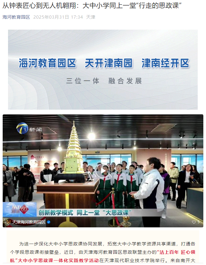 天津市優(yōu)秀教育工作者、天津市五一勞動獎?wù)芦@得者、南開大學馬克思主義學院劉一博老師指出,本次課程是對大中小學思政課一體化建設(shè)的有力探索,突破了以往僅將“一體化”局限于教師團隊中的定勢,為思政課一體化建設(shè)提供了可供參考的范本。今后,海河教育園區(qū)管委會將進一步發(fā)揮服務(wù)職能,深化產(chǎn)教融合,拓展思政教育新維度,凝聚大中小一體化思政教學合力,增強院校互動、校企聯(lián)動,為科教興市、人才強市注入思政動能,開創(chuàng)思政工作高質(zhì)量發(fā)展新局面。