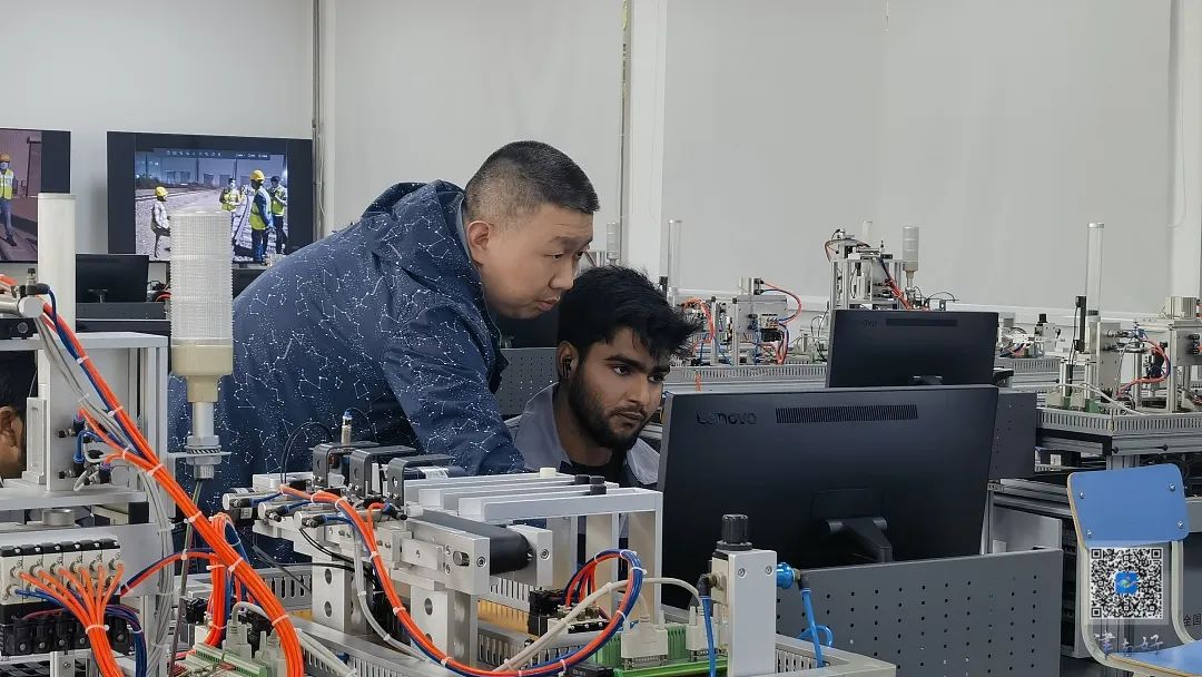 在天津現(xiàn)代職業(yè)技術(shù)學(xué)院魯班工坊的智能機(jī)械實(shí)訓(xùn)室,來(lái)自巴基斯坦的學(xué)員法魯克輕觸操作屏,興奮地向指導(dǎo)老師展示剛編寫(xiě)的控制程序,他說(shuō):“因?yàn)槲覀儗W(xué)習(xí)的設(shè)備都是中國(guó)最先進(jìn)的教學(xué)設(shè)備,這在巴基斯坦是沒(méi)有的,所以我感覺(jué)魯班工坊很有趣。”