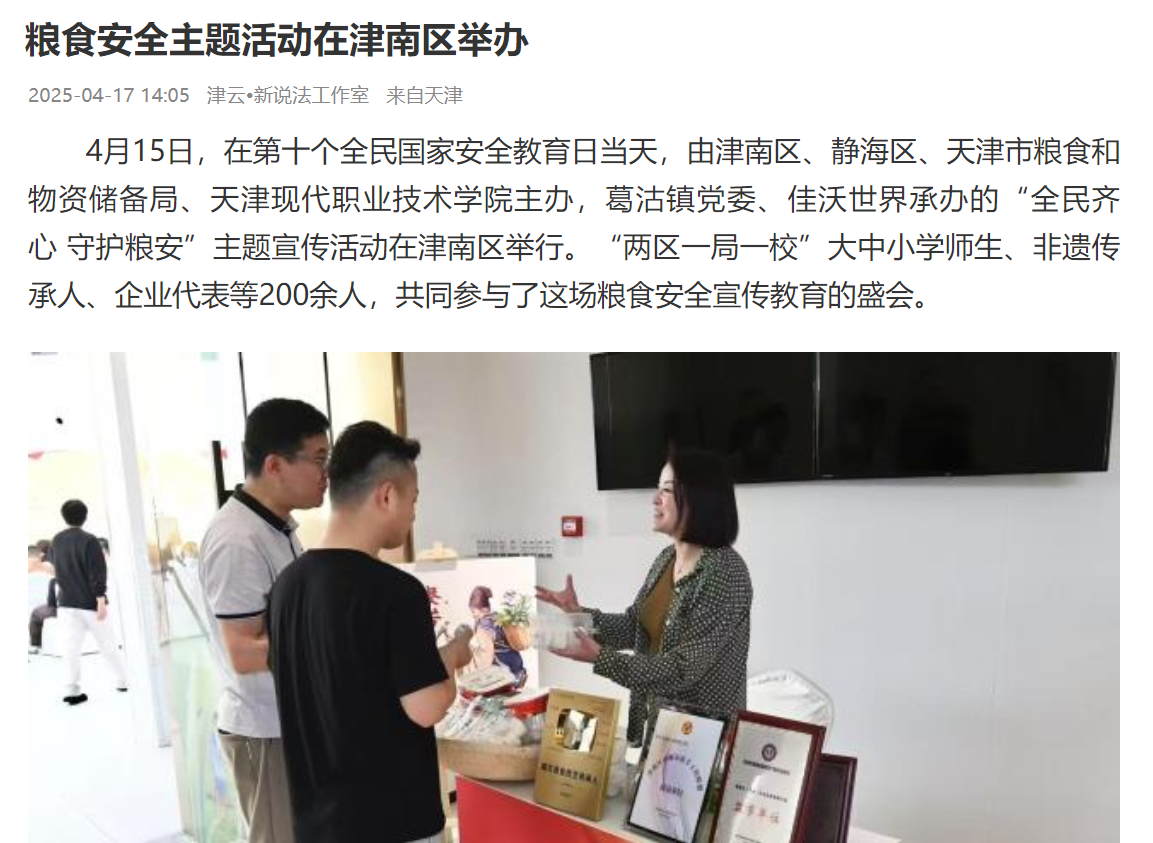 4月15日,在第十個全民國家安全教育日當天,由津南區、靜海區、天津市糧食和物資儲備局、天津現代職業技術學院主辦,葛沽鎮黨委、佳沃世界承辦的“全民齊心 守護糧安”主題宣傳活動在津南區舉行?!皟蓞^一局一?!贝笾行W師生、非遺傳承人、企業代表等200余人,共同參與了這場糧食安全宣傳教育的盛會。