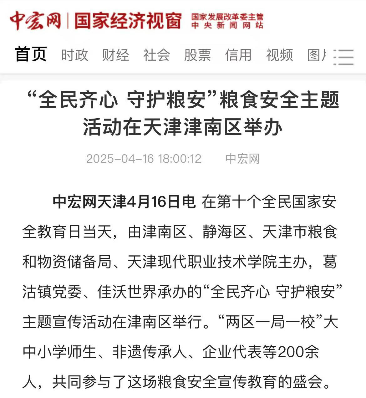 中宏網天津4月16日電在第十個全民國家安全教育日當天,由津南區、靜海區、天津市糧食和物資儲備局、天津現代職業技術學院主辦,葛沽鎮黨委、佳沃世界承辦的“全民齊心 守護糧安”主題宣傳活動在津南區舉行。“兩區一局一校”大中小學師生、非遺傳承人、企業代表等200余人,共同參與了這場糧食安全宣傳教育的盛會。