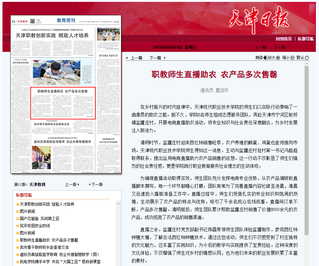 此次電商直播助農(nóng)活動也是天津現(xiàn)代職業(yè)技術學院深化產(chǎn)教融合,推動職業(yè)教育服務社會的生動實踐。未來,學院將繼續(xù)發(fā)揮專業(yè)優(yōu)勢,培養(yǎng)學生的社會責任感與實踐能力,為鄉(xiāng)村振興事業(yè)貢獻更多力量,書寫職業(yè)教育服務社會的新篇章。