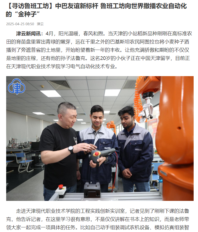 2017年,天津現代職業技術學院與巴基斯坦旁遮普省技術教育與職業培訓局簽約共建巴基斯坦魯班工坊,打造服務“一帶一路”建設和“中巴經濟走廊”的人文交流項目。2018年7月魯班工坊正式揭牌運營以來,以旁遮普省會工業城市拉合爾為中心,服務巴基斯坦工業現代化人才儲備,同時聯動輻射農業城市木爾坦,助力巴基斯坦農業機械化轉型升級,形成“一省兩城雙職能”的建設成效。項目創新了“0.5+2+0.5”中巴聯合培養育人模式,課程納入巴基斯坦職業資格框架體系。
