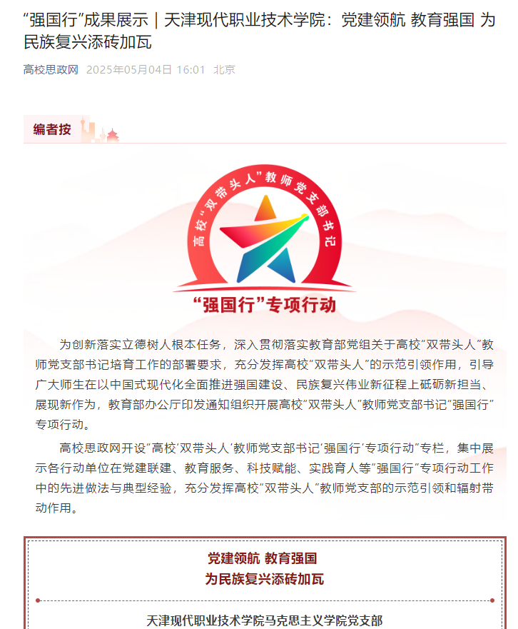 高校思政網開設“高校‘雙帶頭人’教師黨支部書記‘強國行’專項行動”專欄,集中展示各行動單位在黨建聯建、教育服務、科技賦能、實踐育人等“強國行”專項行動工作中的先進做法與典型經驗,充分發揮高校“雙帶頭人”教師黨支部的示范引領和輻射帶動作用。