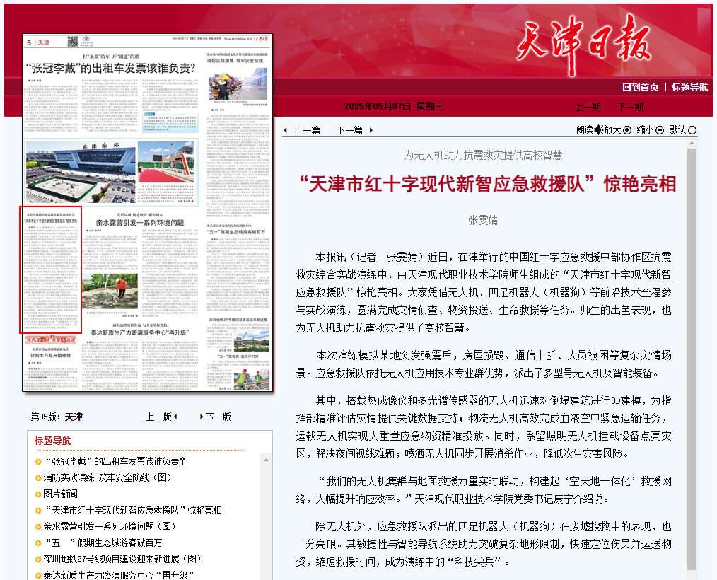作為國內(nèi)高職院校無人機應用技術(shù)專業(yè)建設(shè)的領(lǐng)跑者,天津現(xiàn)代職業(yè)技術(shù)學院持續(xù)深耕應急救援科技,已開發(fā)多套災害場景解決方案。“學院將深化‘產(chǎn)學研用’協(xié)同創(chuàng)新,推動智能裝備與應急救援深度融合,為防災減災體系現(xiàn)代化注入高校智慧。”康寧表示。