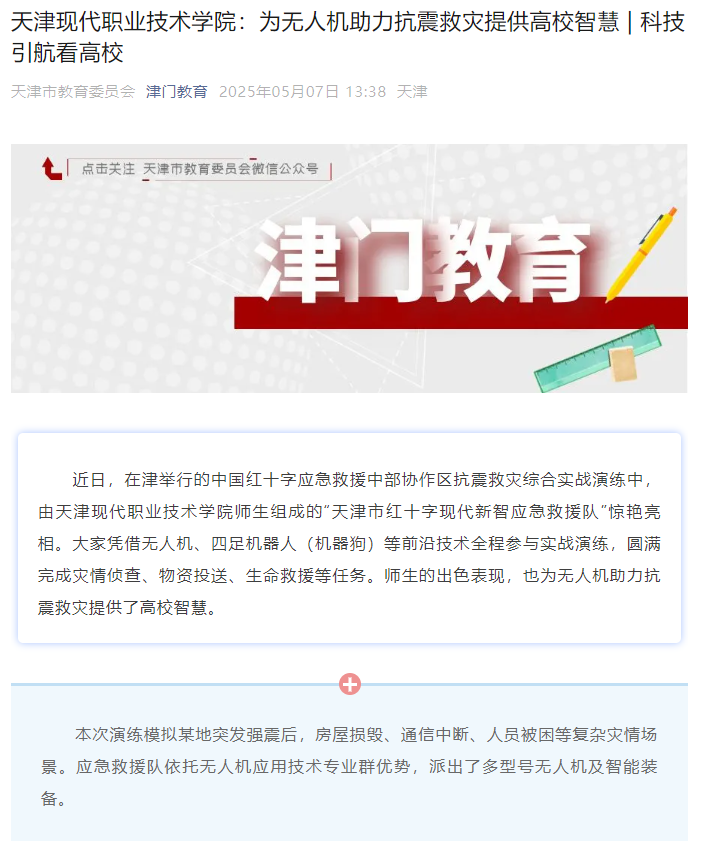 據了解,今年3月,由天津現代職業技術學院與市紅十字會合作組建的“天津市紅十字現代新智應急救援隊”正式成立,通過整合學院無人機應用技術專業群優勢與紅十字會救援網絡,有效提升復雜災害場景響應能力,推動人工智能、無人機等前沿技術在生命救援領域的應用轉化。雙方的合作涵蓋七大領域,包括共建應急救援培訓基地、聯合開展實戰演練等。