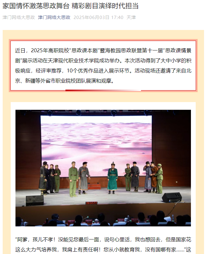 近日,2025年高職院校“思政課本劇”暨海教園思政聯盟第十一屆“思政課情景劇”展示活動在天津現代職業技術學院成功舉辦。本次活動得到了大中小學的積極響應,經評審推薦,10個優秀作品進入展示環節。活動現場還邀請了來自北京、新疆等外省市職業院校團隊展演和觀摩。