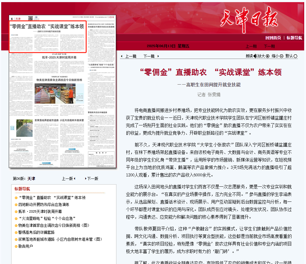 將電商直播間搬進鄉村養殖場,把專業技能轉化為助農實效,更在服務鄉村振興中收獲了寶貴的就業機會——近日,天津現代職業技術學院學生團隊在寧河區板橋鎮盆罐莊村完成了一場別開生面的社會實踐。他們的“零傭金”助農直播不僅為農戶帶來了實實在在的收益,更成為提升就業競爭力、開辟職業新路徑的“實戰課堂”。