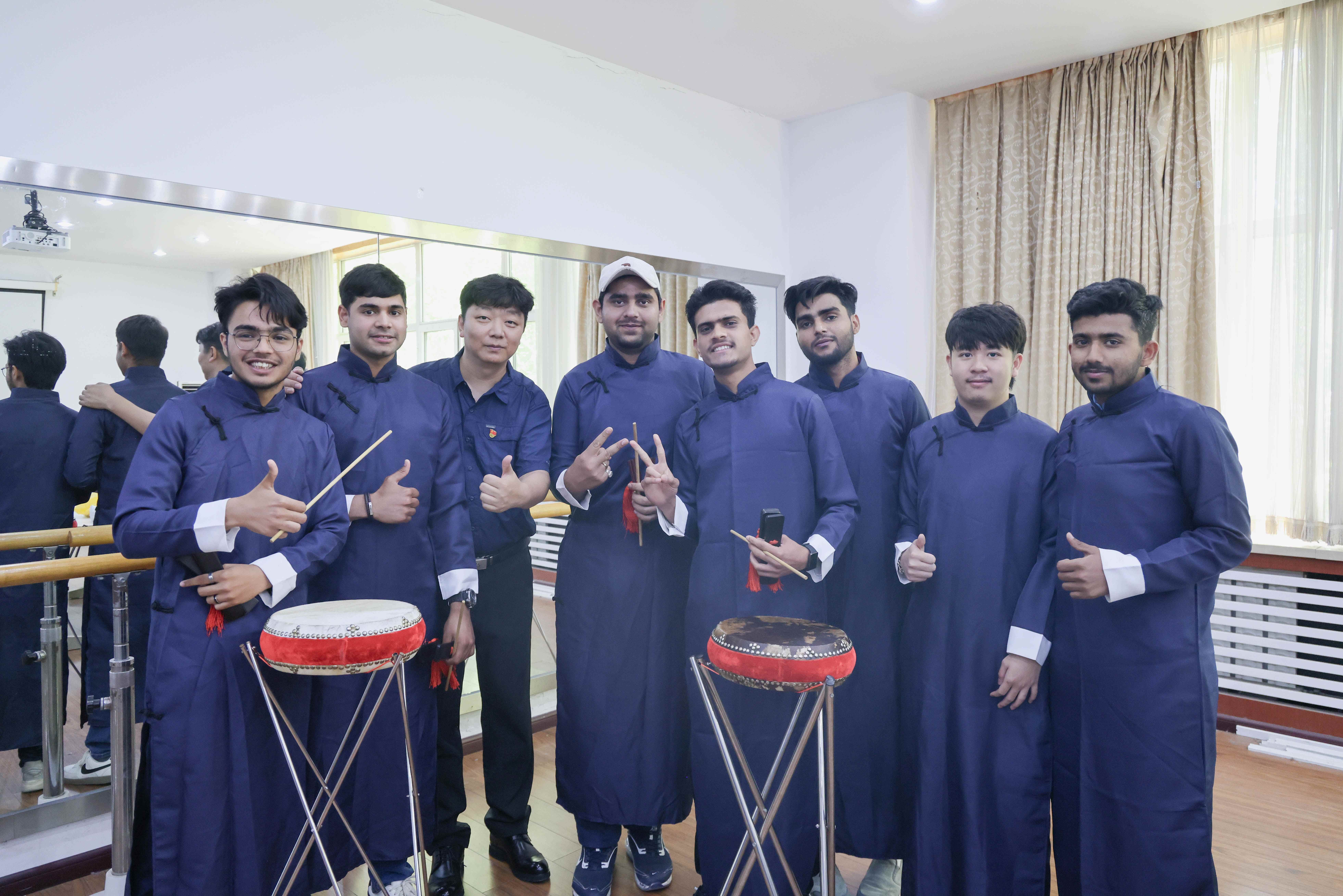 活動特邀學院非遺曲藝研習社指導教師現場教學,為來自巴基斯坦、老撾的留學生講授天津曲藝的發展史及京韻大鼓的特色。留學生們首次接觸京韻大鼓簡板和書鼓,在老師指導下學習基礎動作。來自巴基斯坦的祖貝爾體驗之后分享道:“京韻大鼓的節奏和漢語聲調完美結合,學習它讓我更懂中國語言的韻律美。”