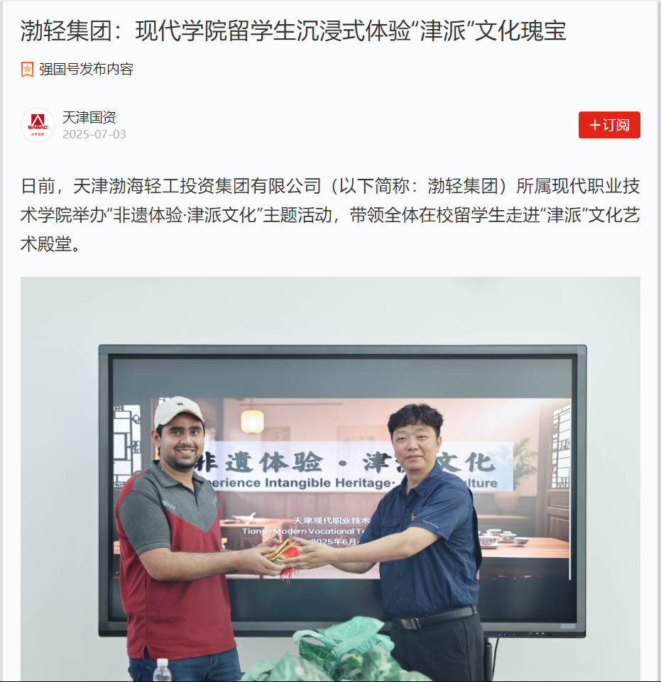 日前,天津渤海輕工投資集團有限公司(以下簡稱:渤輕集團)所屬現代職業技術學院舉辦“非遺體驗·津派文化”主題活動,帶領全體在校留學生走進“津派”文化藝術殿堂。