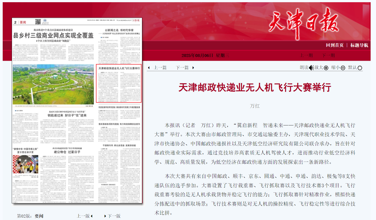 本報訊(記者 萬紅)昨天,“翼啟新程 智遞未來——天津郵政快遞業無人機飛行大賽”舉行。本次大賽由市郵政管理局、市交通運輸委主辦,天津現代職業技術學院、天津市快遞協會、中國郵政快遞報社以及天津低空經濟研究院有限公司聯合承辦,旨在針對郵政快遞業實際需求,通過競技培養高素質無人機駕駛人才,進而推動行業低空經濟科學、規范、高質量發展,為低空經濟在郵政快遞方面的發展探索出一條新路徑。