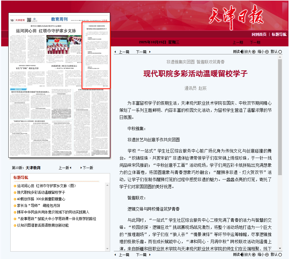 為豐富留校學子的假期生活,天津現代職業技術學院在國慶、中秋雙節期間精心策劃了一系列主題鮮明、內容豐富的校園文化活動,為留校學生營造了溫馨濃厚的節日氛圍。